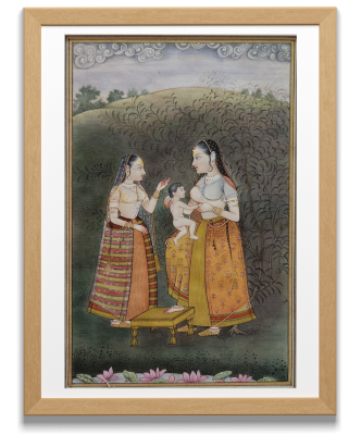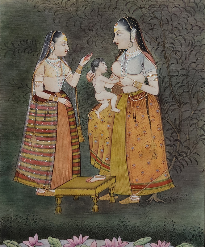 A Mughal miniature painting depicting a royal mother breastfeeding her child, attended by a maid in a lush garden setting.