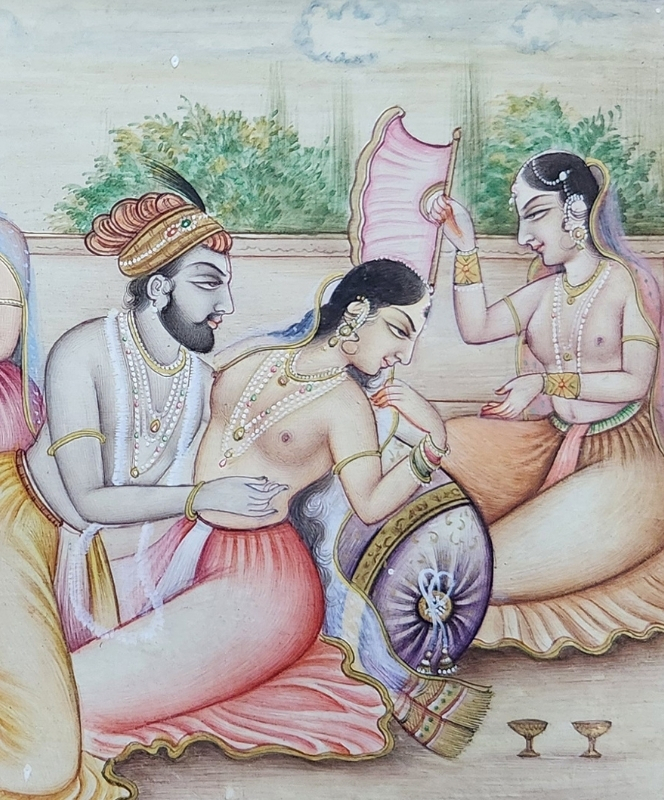 A detailed miniature painting depicting a royal couple enjoying a serene moment in a garden.