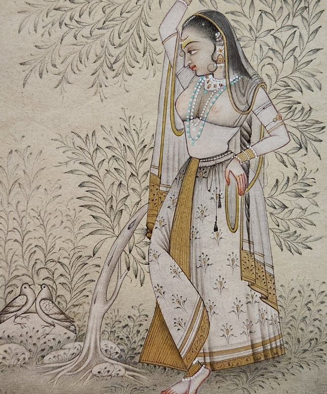 A detailed miniature painting depicting a lady in traditional attire, set against a lush, intricate background.