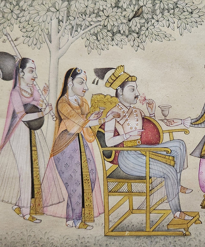 A traditional Indian miniature painting depicting a royal court scene with elegantly dressed figures.
