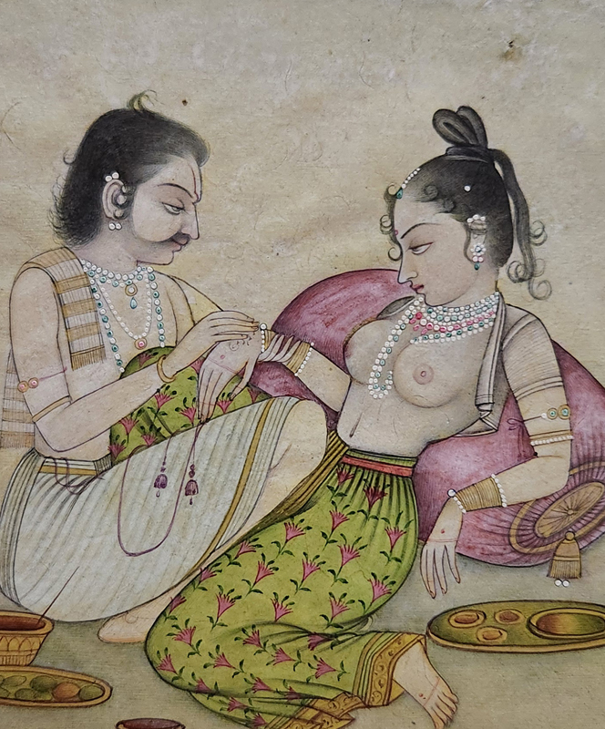 A Mughal miniature painting depicting an intimate moment between two figures adorned in traditional attire.