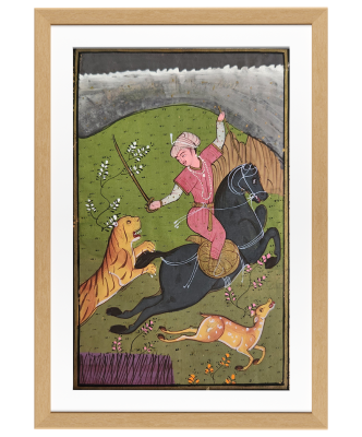 A vibrant miniature painting depicting a royal figure on horseback hunting a tiger and a deer.