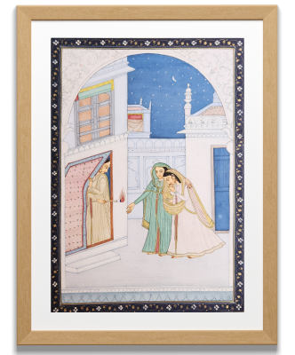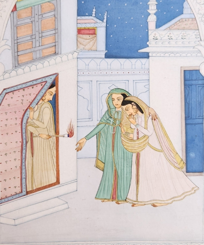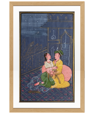 A delicate miniature painting depicting an intimate moment between two figures in a palace setting under a starry night sky.
