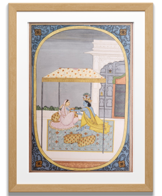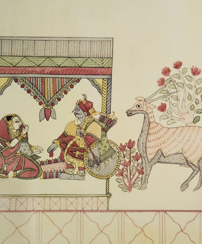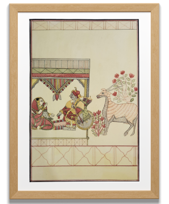 A traditional Indian painting depicting a royal court scene with two figures and a deer amidst a floral background.