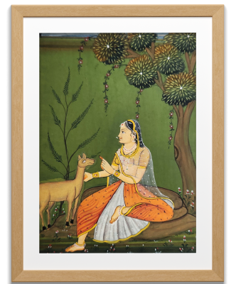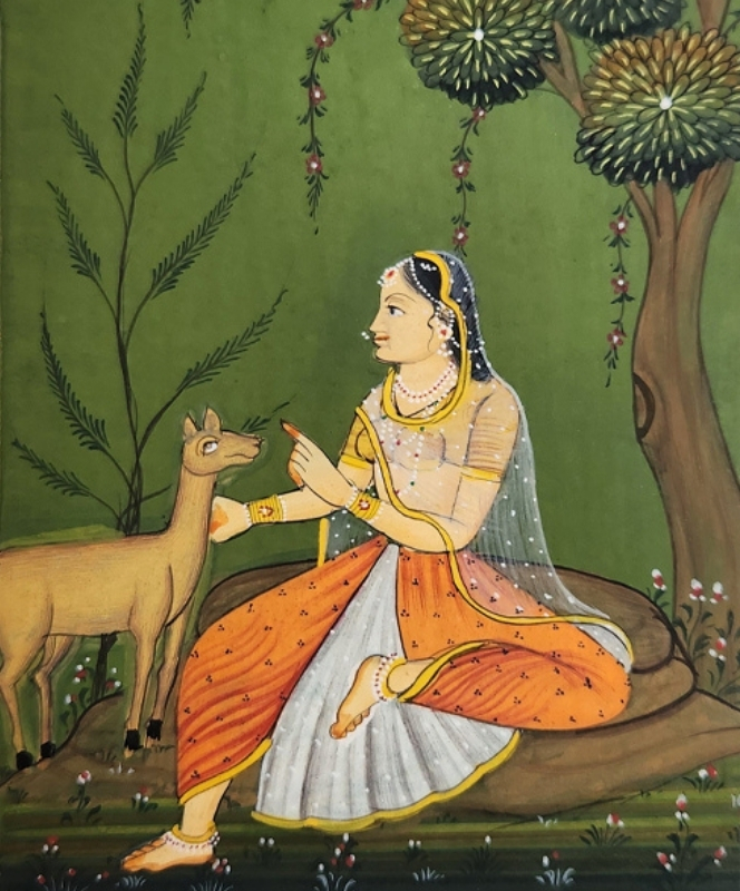 A traditional miniature painting depicting a lady interacting with a deer in a lush garden setting.