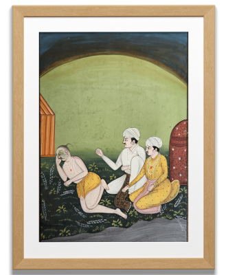 A traditional Indian painting depicting a royal scene with a king, two servants, and a woman presenting a serpent.