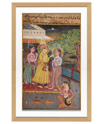 A detailed miniature painting depicting a royal court scene with elegantly dressed figures under a night sky.