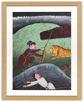 A traditional miniature painting depicting a dramatic encounter between two individuals and a tiger.
