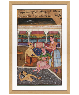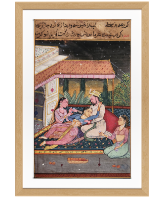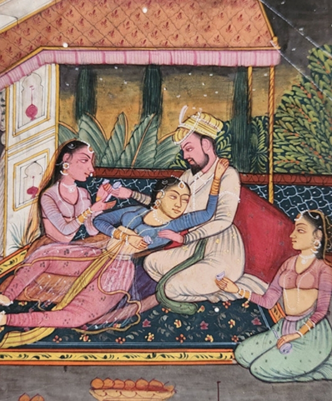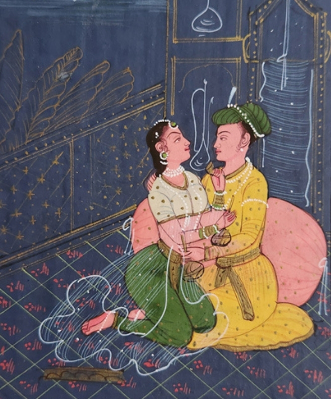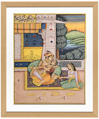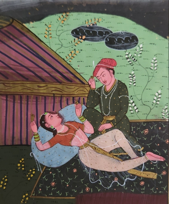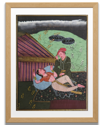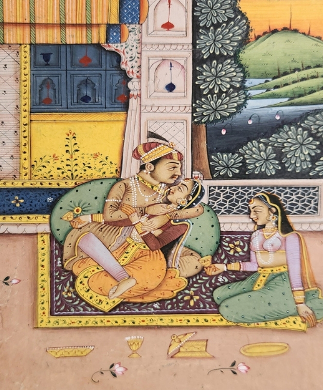 A detailed miniature painting depicting a royal couple engaged in an intimate moment under a canopy.