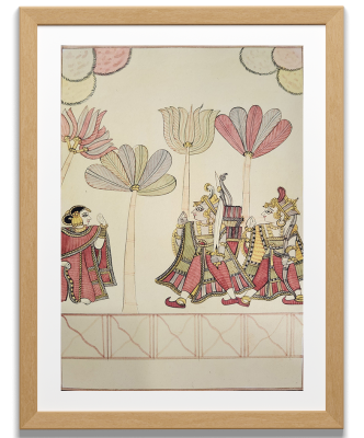 A detailed miniature painting depicting a royal court scene with three figures under a canopy, surrounded by lush greenery.