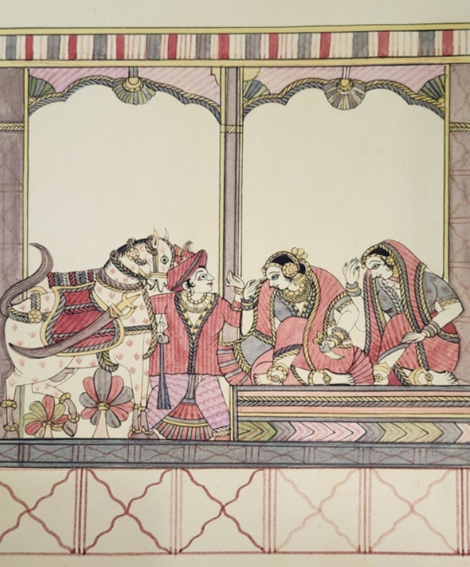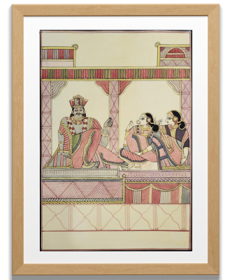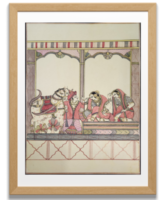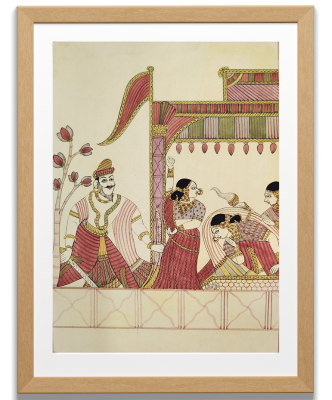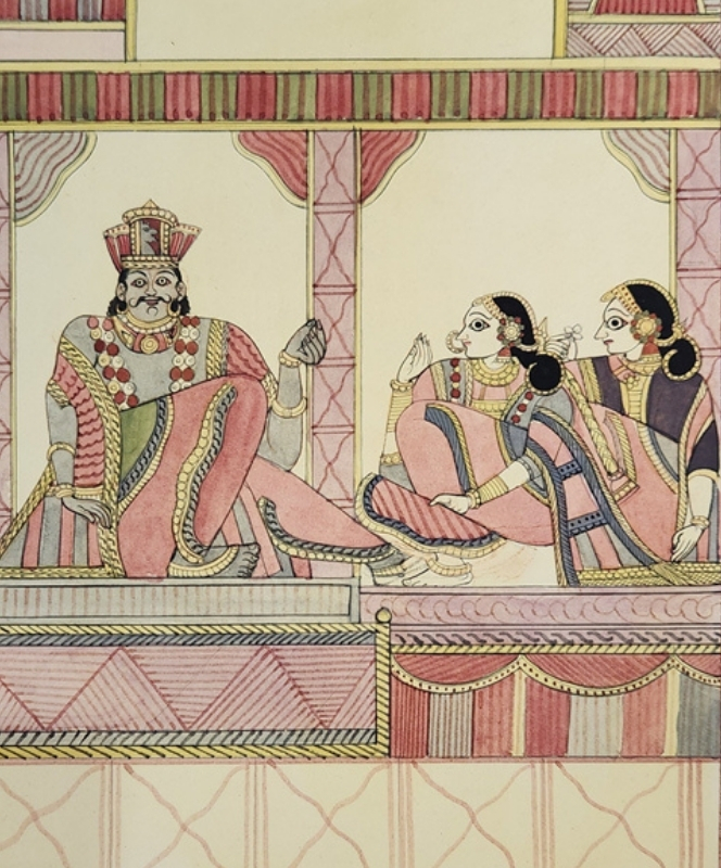 A traditional Indian painting depicting a royal court scene with intricate details and vibrant colors.