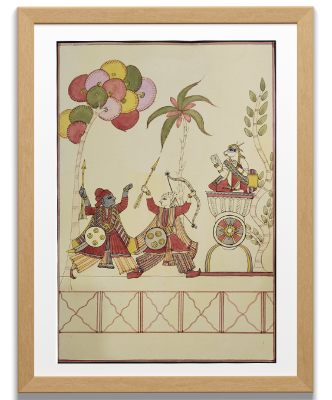 A traditional Indian painting depicting a royal procession with musicians and a chariot.