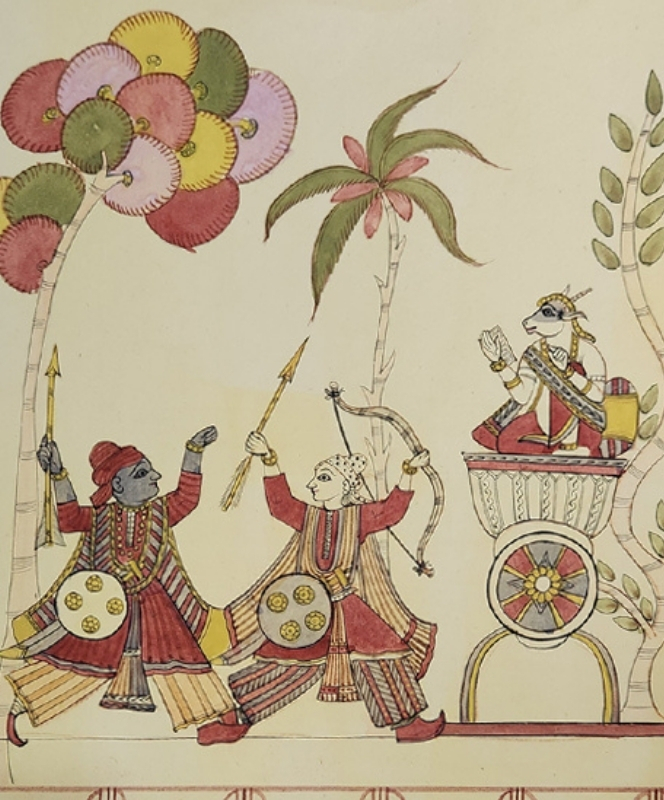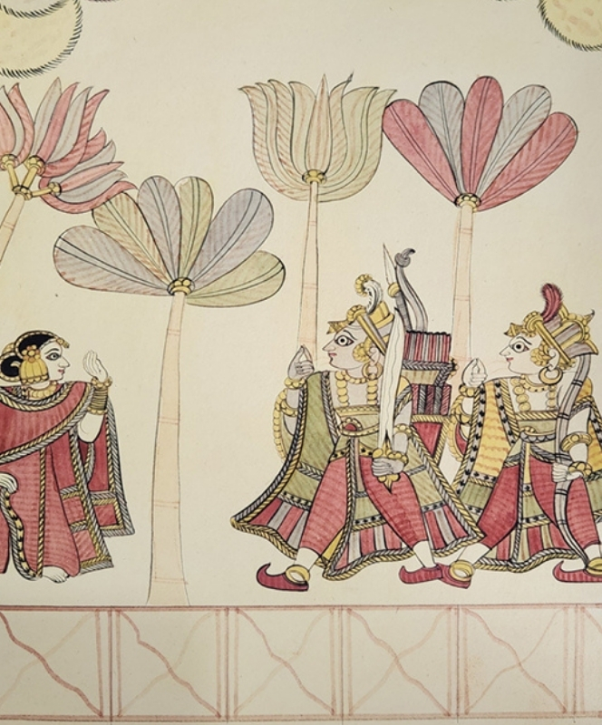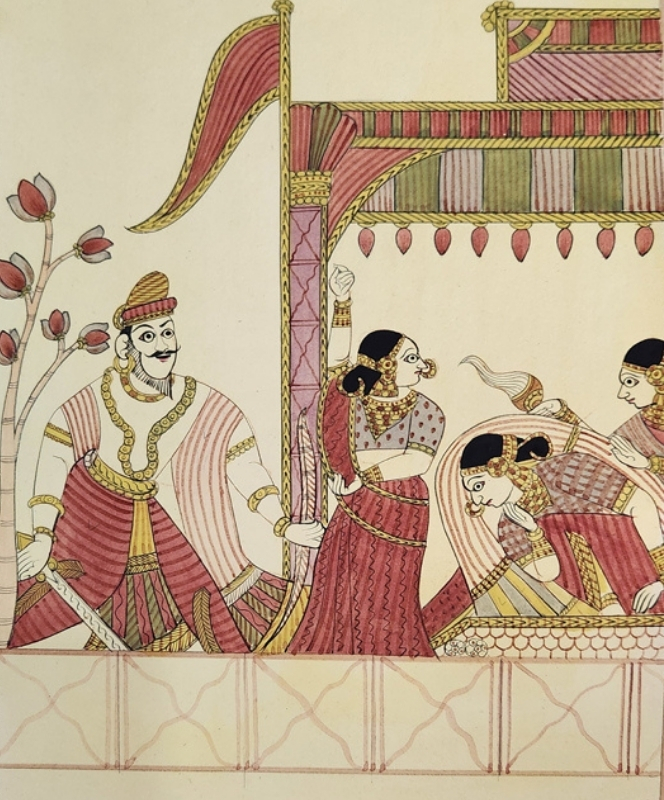A traditional Indian painting depicting two kings approaching a queen under ornate parasols.