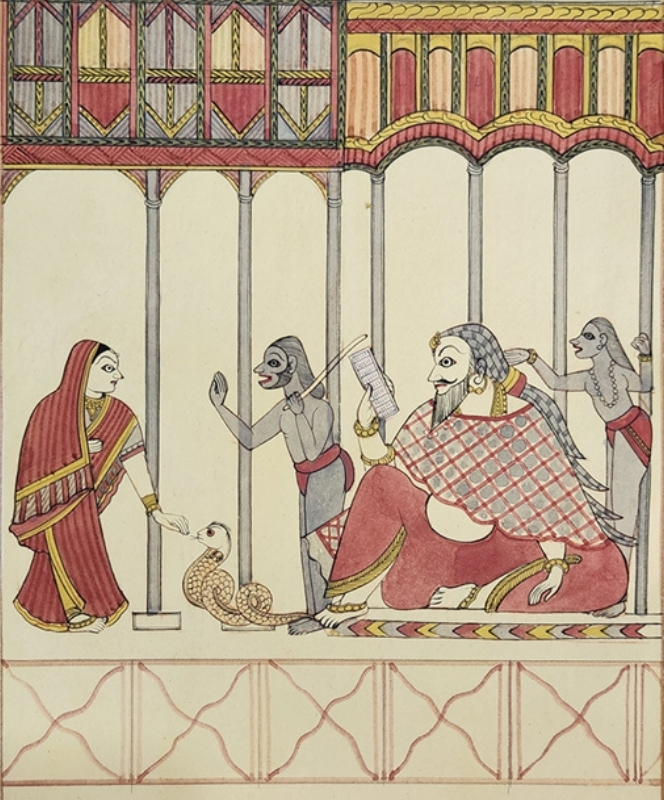 A traditional Indian painting depicting a royal scene with a king, two servants, and a woman presenting a snake.