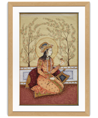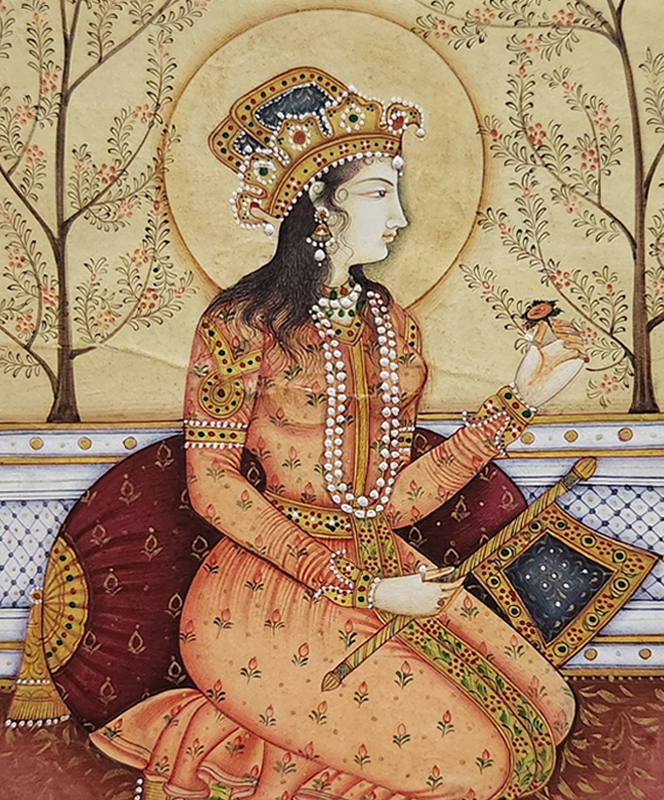 A detailed miniature painting depicting a regal lady adorned in traditional attire, holding a bird, set against a backdrop of blossoming trees.