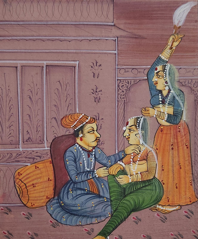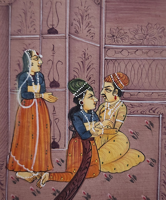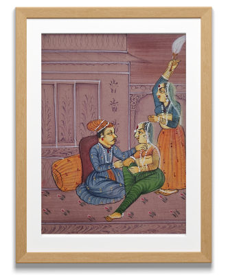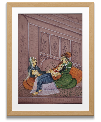This exquisite miniature painting portrays a royal couple in an intimate moment, symbolizing love, elegance, and cultural richness.
