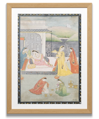 This traditional Indian miniature painting captures a vibrant royal court scene, showcasing elegantly dressed women engaged in various activities within a palace setting.