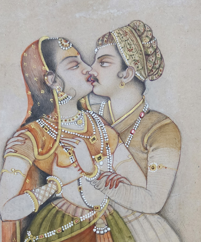 A delicate Mughal miniature painting depicting a romantic couple in traditional attire.