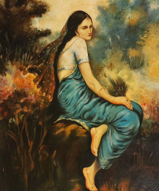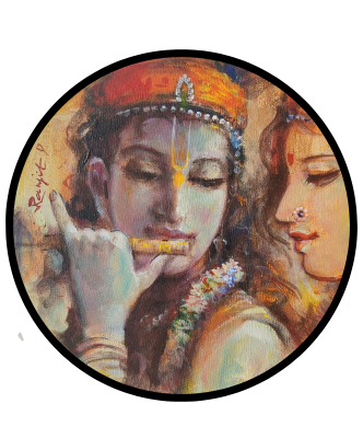 An enchanting oil painting depicting Radha and Krishna in a loving embrace amidst a serene landscape.