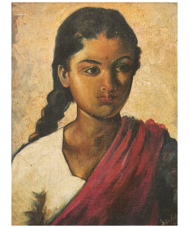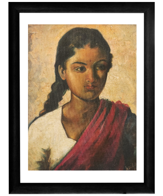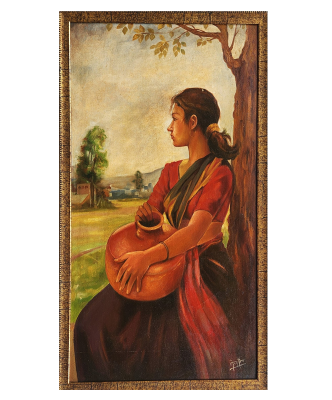 An oil painting depicting a woman in traditional attire with a red shawl draped over her shoulder.