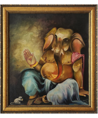 An oil painting depicting Lord Ganesha in a serene and blessing posture, accompanied by his mouse companion.
