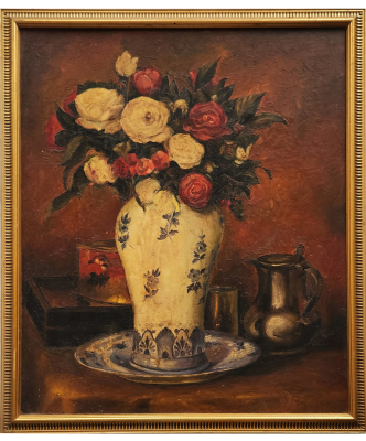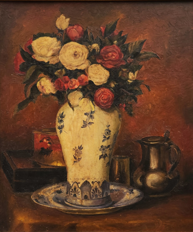 A classic still life oil painting featuring a bouquet of flowers in a porcelain vase, accompanied by a metallic pitcher.