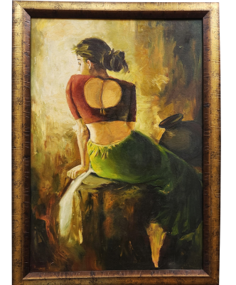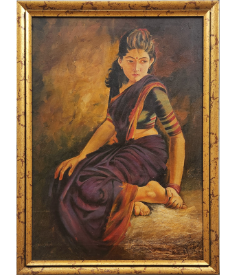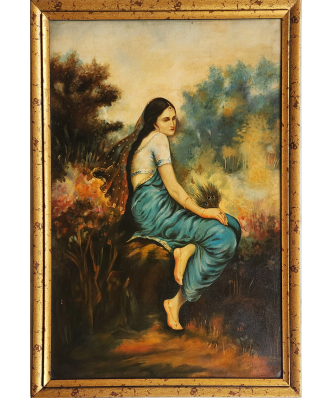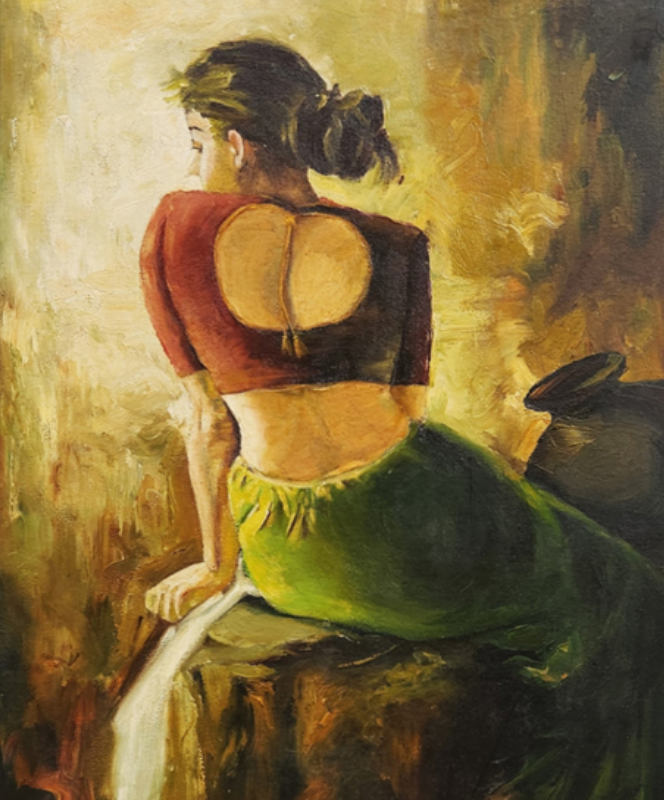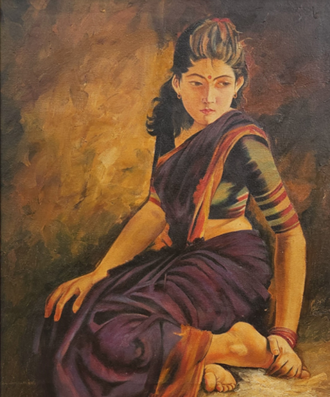 A serene oil painting depicting a woman in traditional attire, seated gracefully with a contemplative posture.