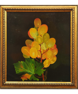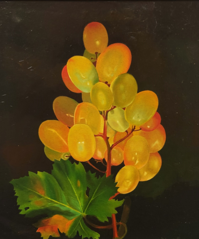A vibrant oil painting depicting a cluster of golden grapes with lush green leaves against a dark background.