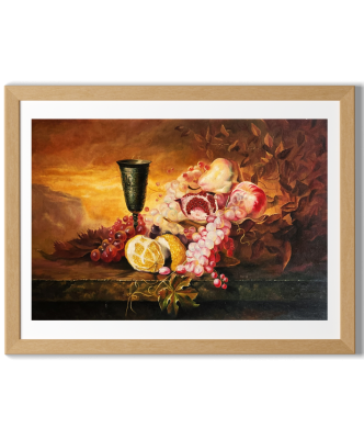 A vibrant still life oil painting depicting an assortment of fruits and a decorative goblet against a warm, sunset backdrop.