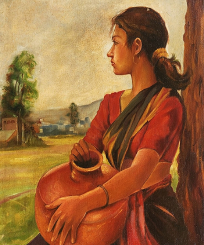 A woman in traditional attire sits by a tree, holding a clay pot, with a serene rural landscape in the background.