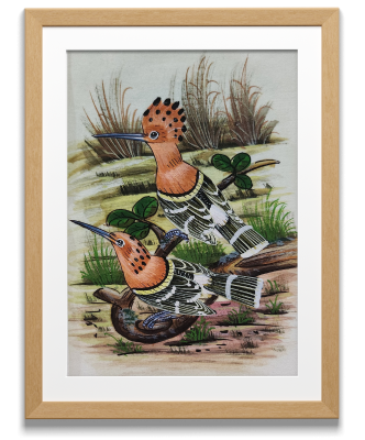 A vibrant watercolor painting depicting two hoopoes perched in a lush, natural setting.