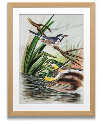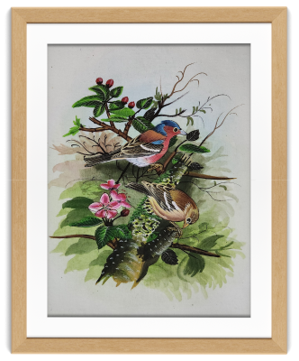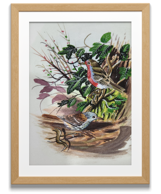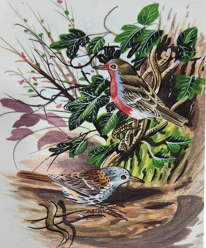 A vibrant watercolor painting depicting two birds amidst lush foliage in a serene woodland setting.