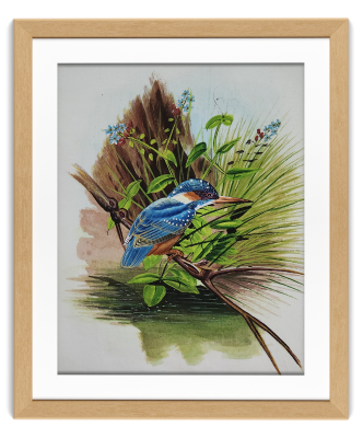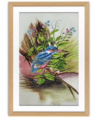 A vibrant watercolor painting of a kingfisher perched on a branch amidst lush reeds and flowers.