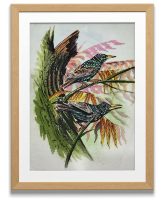 A vibrant watercolor painting depicting two starlings perched on colorful foliage