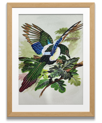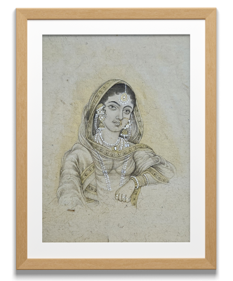 A hand-painted homage to traditional South Asian attire, rendered in original mineral colors with floral finesse