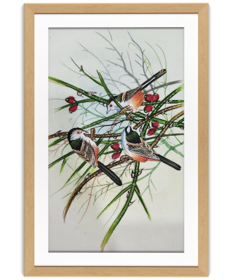 A delicate watercolor painting depicting three birds perched on branches adorned with red berries.