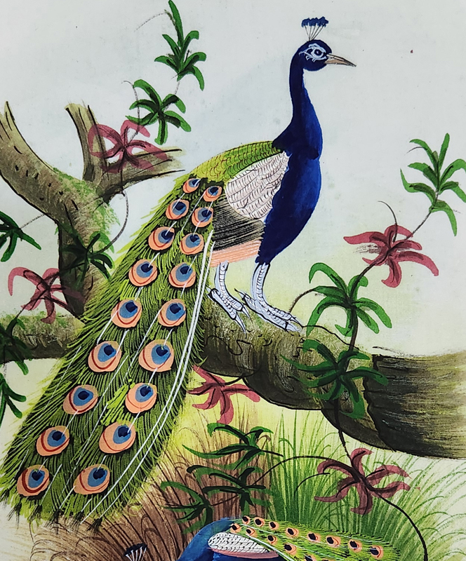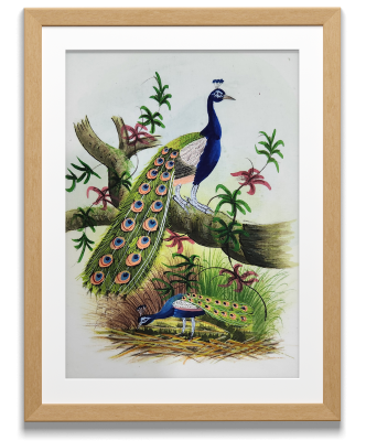 A vibrant watercolor painting depicting two peacocks amidst lush greenery and blooming flowers.