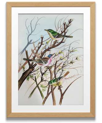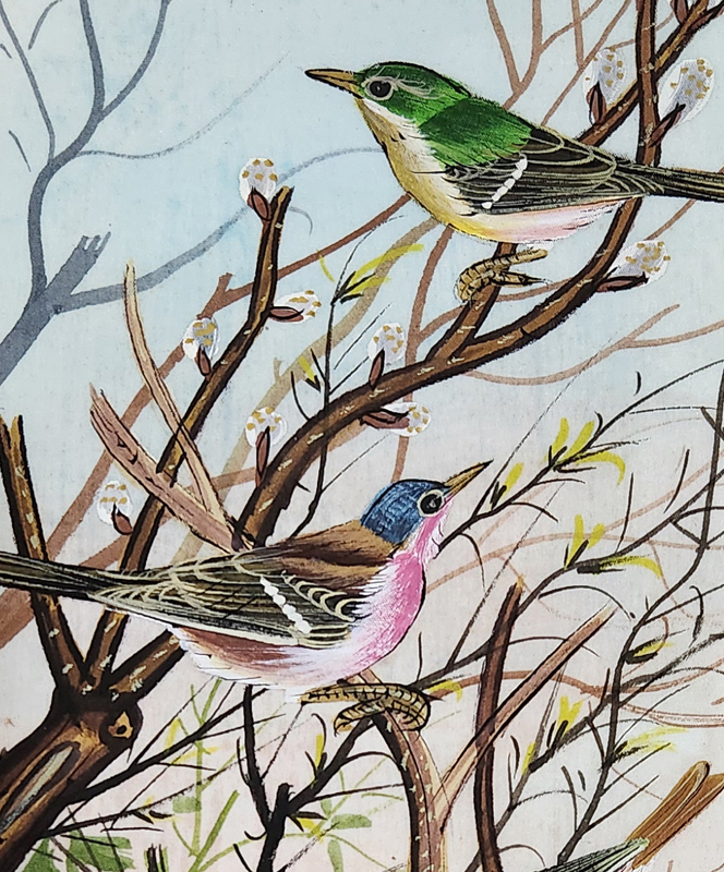 A vibrant watercolor painting depicting three colorful birds perched on budding branches.