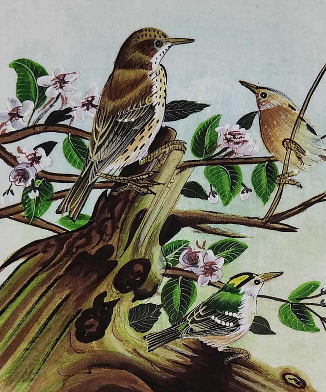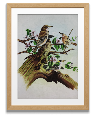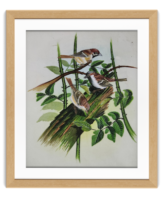 A delicate watercolor painting depicting three sparrows perched on branches amidst lush green foliage.