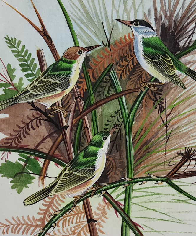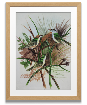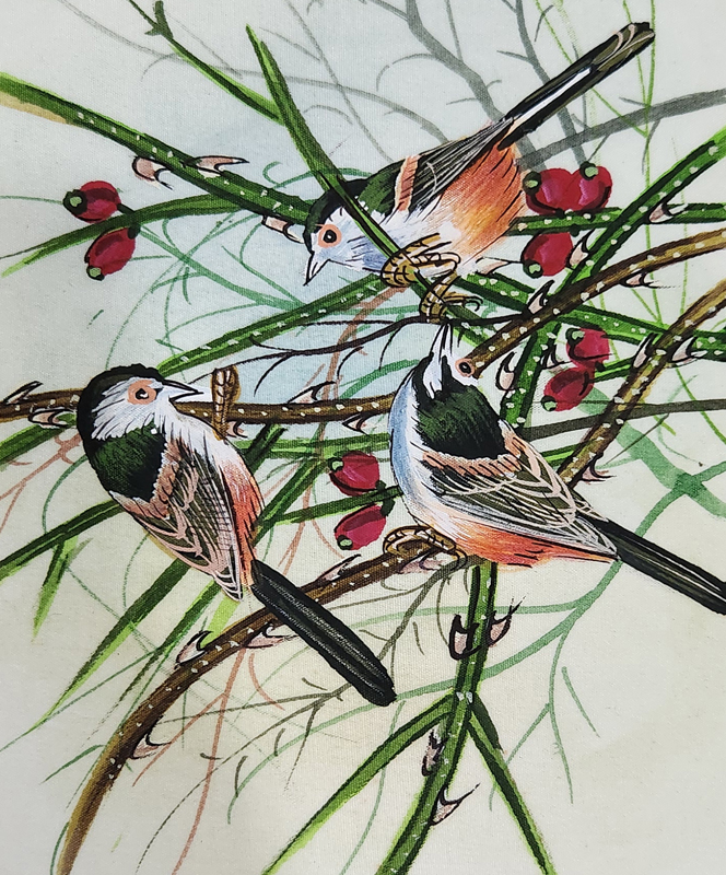 A delicate watercolor painting depicting three green-backed birds perched amidst lush foliage.