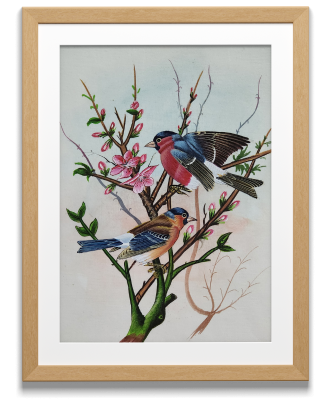 A vibrant watercolor painting depicting two birds perched on a flowering branch.