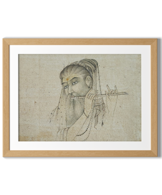 A delicate miniature painting depicting a figure playing a flute, adorned with traditional attire and jewelry.