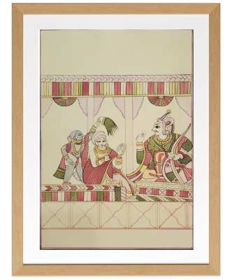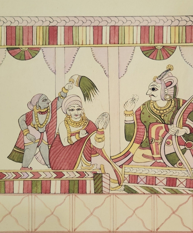 A traditional Indian painting depicting a royal court scene with intricate details and vibrant colors.