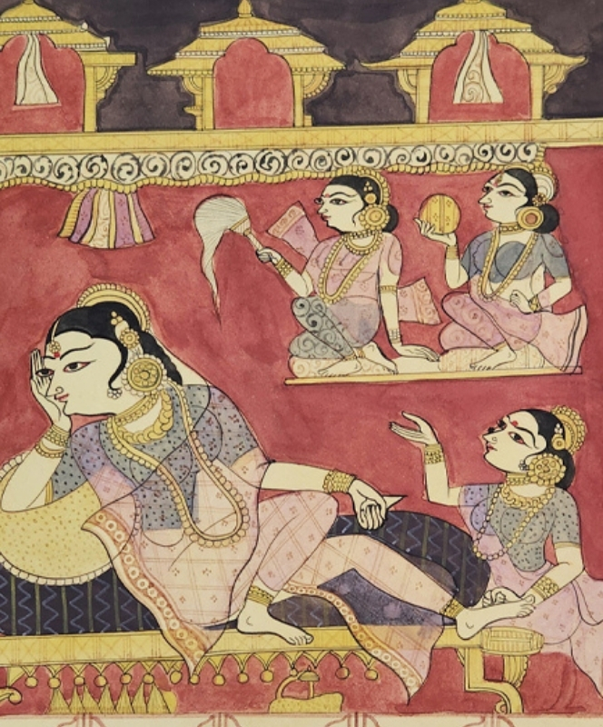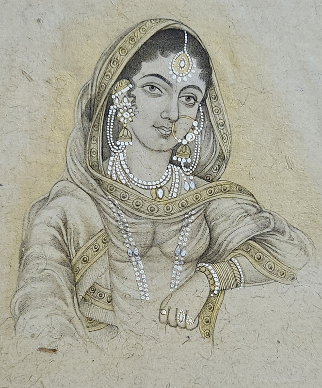 A detailed miniature painting depicting a regal figure adorned in traditional jewelry and attire.