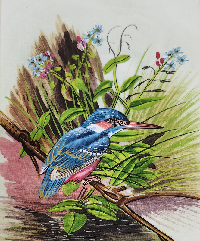 A vibrant water painting of a kingfisher perched on a branch near a stream, surrounded by lush greenery and flowers.