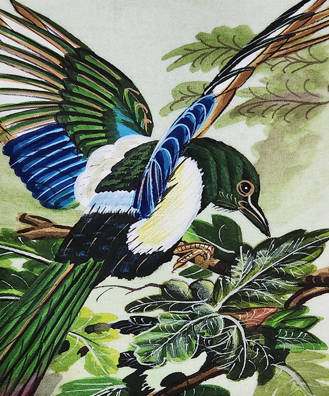 A vibrant depiction of a magpie in mid-flight among lush green foliage.