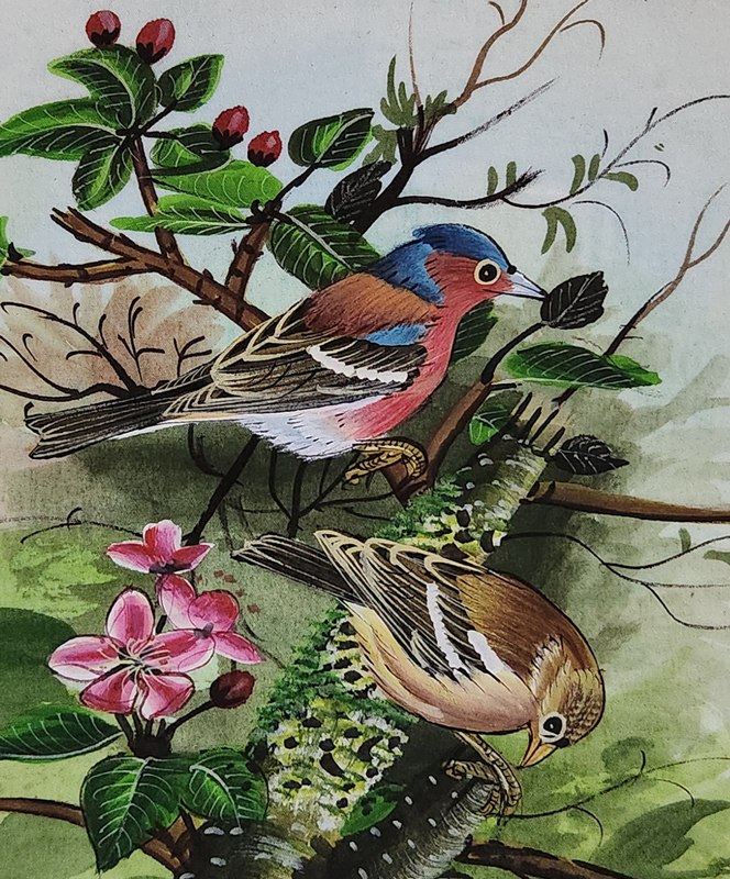 A vibrant watercolor painting depicting two colorful birds perched on blossoming branches.