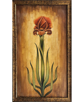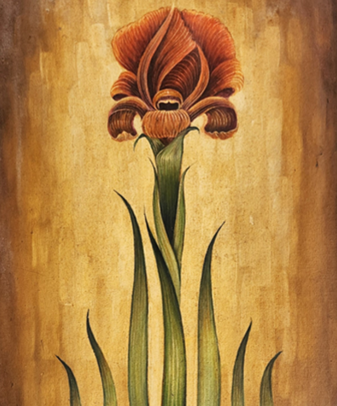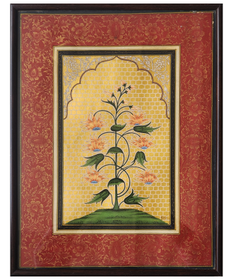 A vibrant miniature painting depicting a stylized flowering plant with intricate details and rich colors.