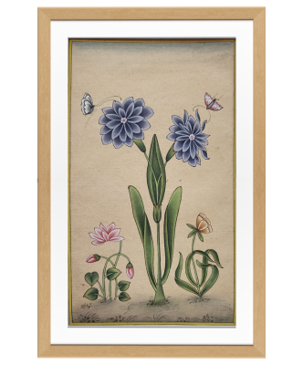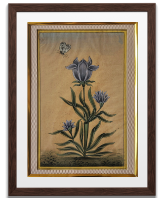 A serene miniature painting depicting a cluster of blue flowers with butterflies fluttering around.