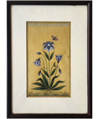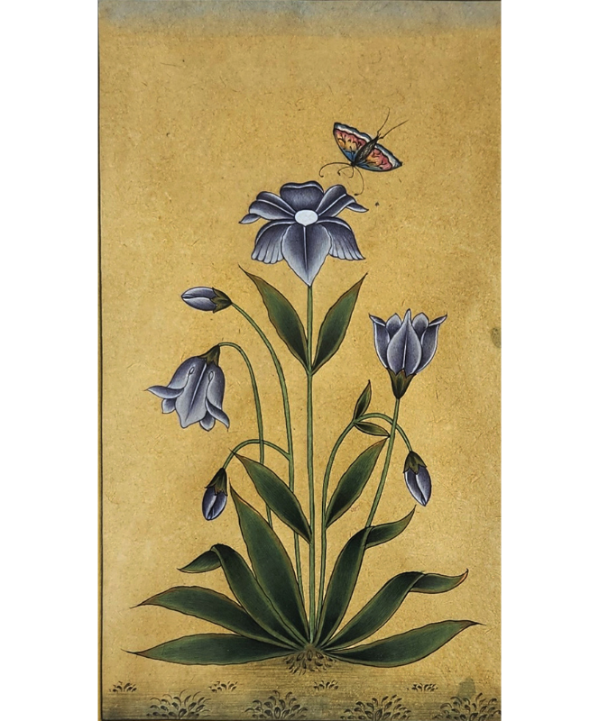 A delicate miniature painting depicting a butterfly hovering over a cluster of blue flowers.